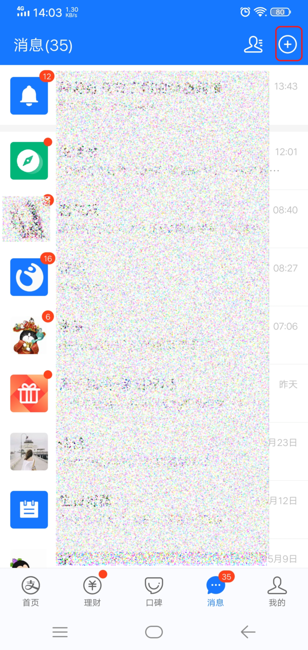 第二步,进入到支付宝的消息界面后,找到界面右上角的【+】加号按钮,并点击它。