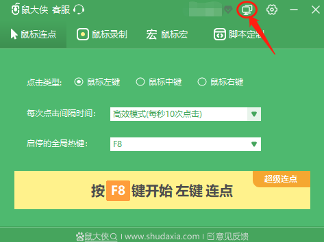 我们打开鼠大侠鼠标连点器,当我们来到主界面,在“登录”按钮和“齿轮”(设置)按钮之间,有个由“两台电脑”组成的图标,它就是多设备管理,我们点击它即可弹出多设备管理框,进行多设备管理。