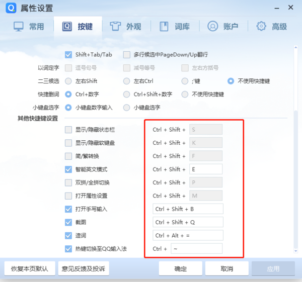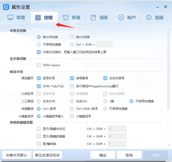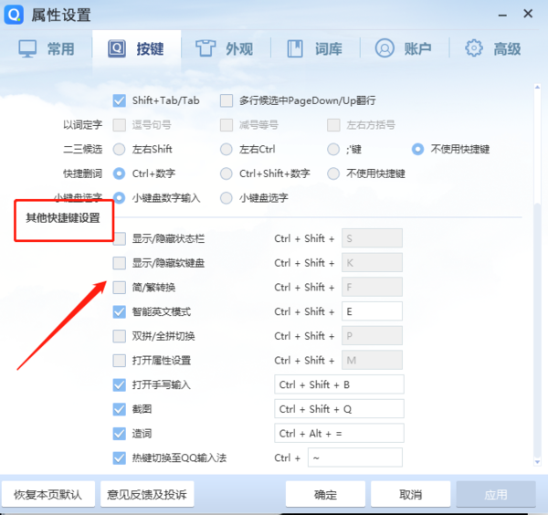 首先第一步在QQ输入法这个界面当中,去点击左侧的按键设置,在右侧就可以看到关于“按键设置”的详细内容了。这时将“其他按键”下面的功能选项,全部勾选。这样就启动了这些功能的快捷键了。