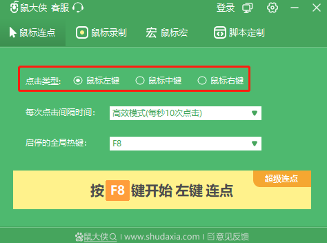 在鼠大侠连点器中,我们不止有鼠标左键的连点,还可以设置鼠标其他键的连点。我们只要在打开鼠大侠,进入鼠标连点模块,在“点击类型”中设置左键、中键、右键连点。不同的类型可以满足我们不同情景的需要。