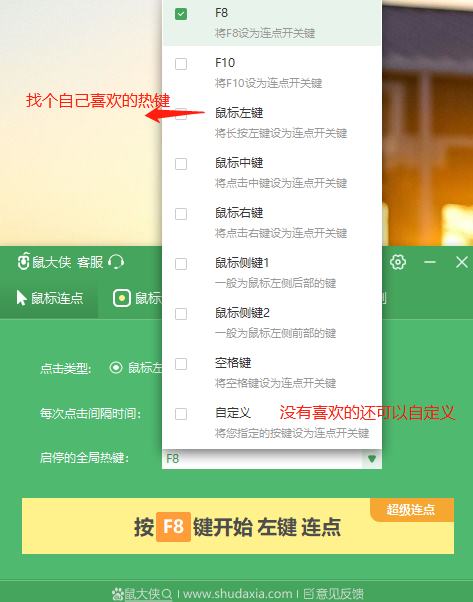 为了能让我们的连点收放自如,鼠大侠开设了“启停热键”,在此我们可以选择一个合适的热键,方便我们操作即可。
