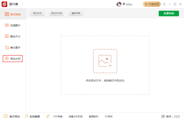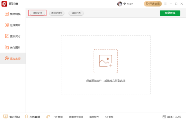 点击上方的添加文件,将需要添加水印的图片上传到软件中。