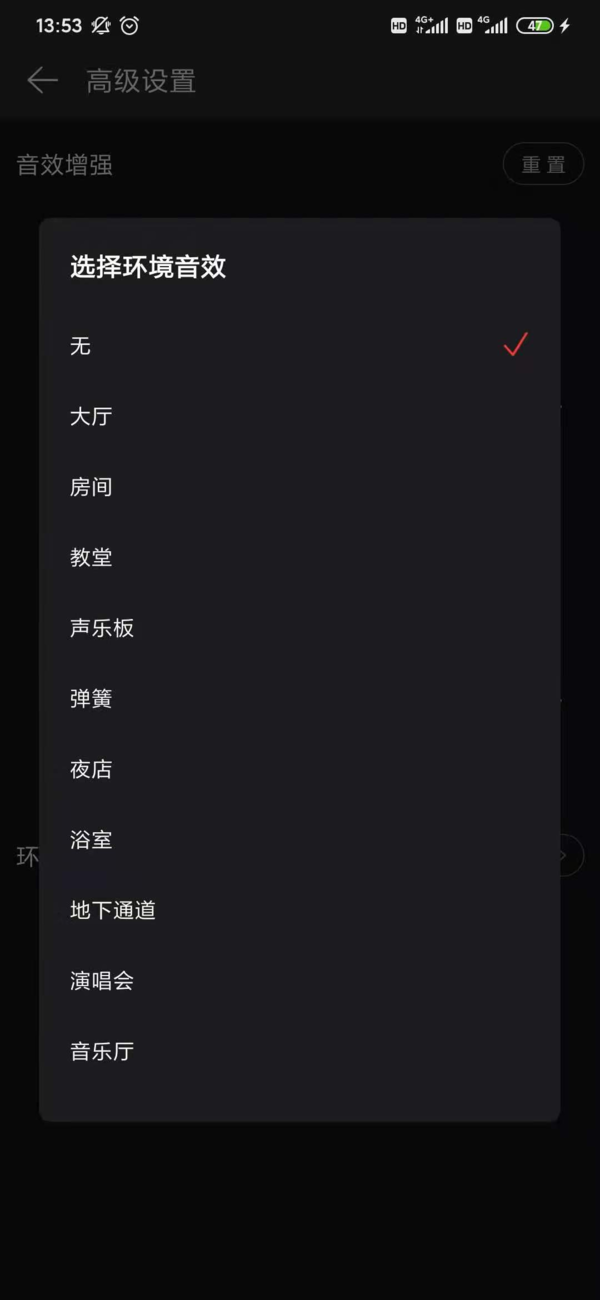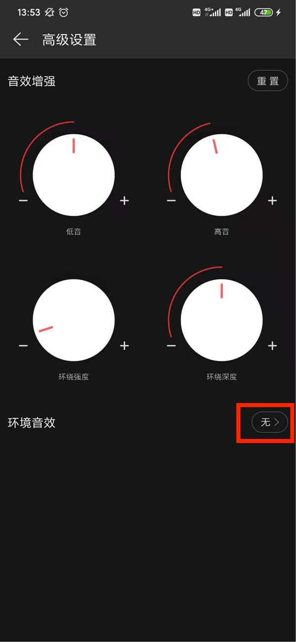 第五步,点击高级设置进入音效增强设置界面了,根据需求对低音、高音、环绕强度、环绕深度还有环境音效进行调整。