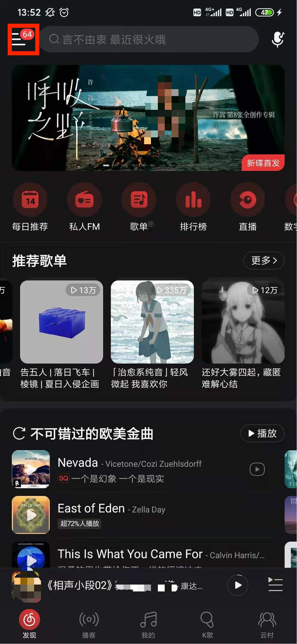 第一步,运行网易云App进入主界面,点击左上角菜单选项;