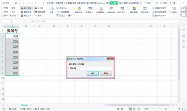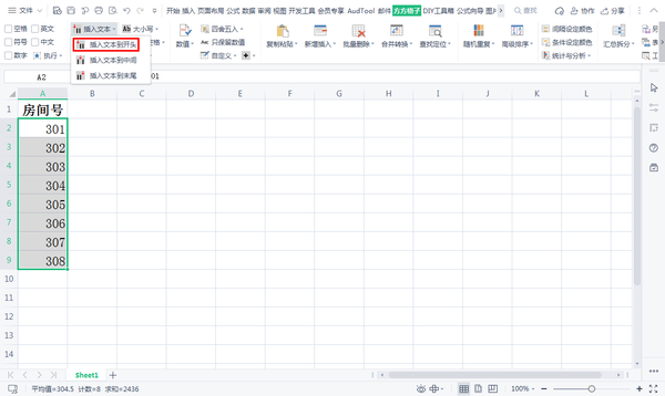 点击菜单栏中的方方格子——插入文本,选择插入文本到开头。