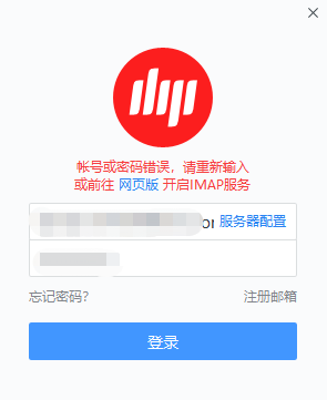 所谓奇怪现象,就是当我们登录其他渠道邮箱号时,即使在保证100%输对账号密码的时候,依然无法登录,并且在网易邮箱大师的登录框上会弹出红字,其意思就是告诉我们,要么是账号密码错了,要么就是邮箱没有开通IMAP,而且大多情况都是后者导致的。