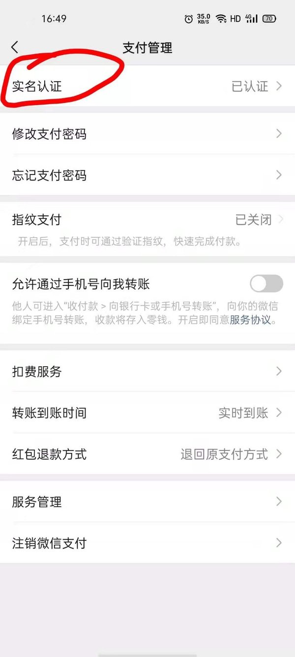第四步,点击之后我们就来到了支付管理页面,在这个页面的第一个选项就是实名认证,微信实名认证的位置就在这里了,点击即可进入。