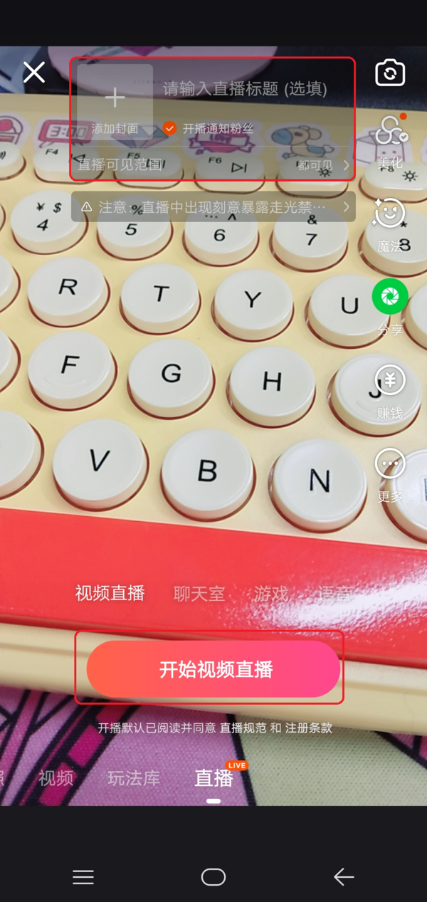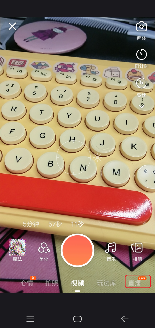 第三步,进入到快手的拍摄界面后,我们在界面的底部,可以看到【直播】功能,点击进入。