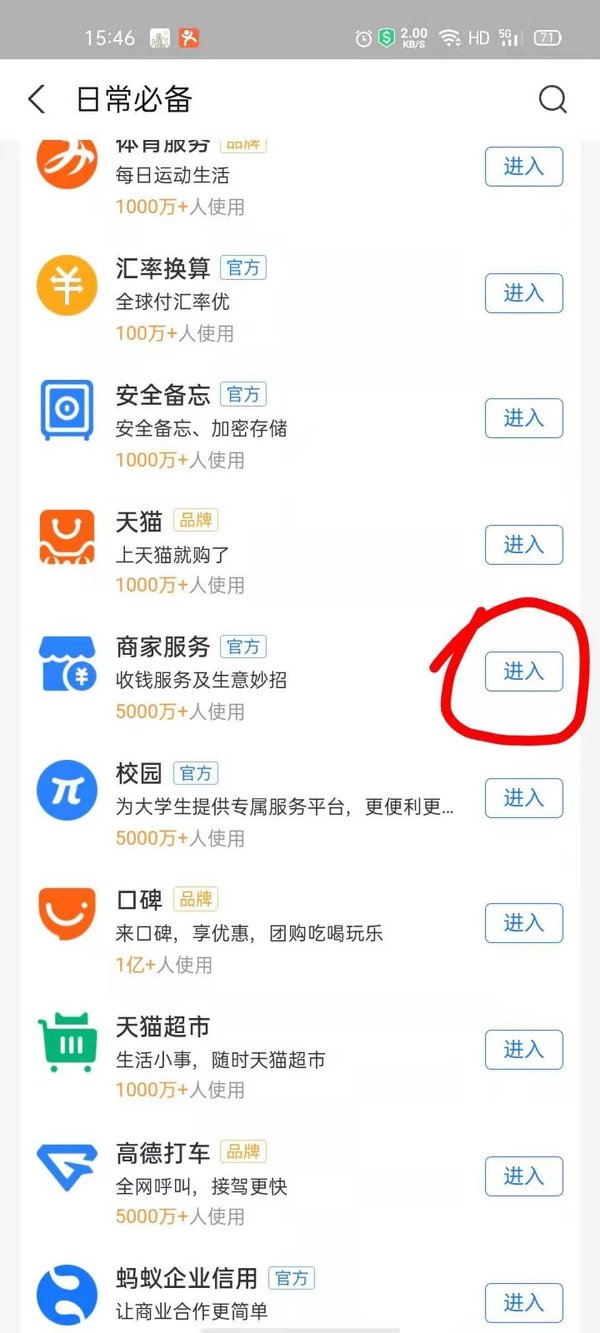 然后点击【日常必备】模块后面的【全部】按钮,滑动手机屏幕找到【商家服务】选项,并点击后面的【进入】按钮。