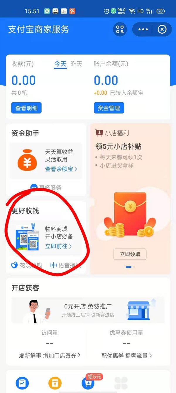 第二步,点击页面中间【更好收钱】下面的【物料商城】按钮,然后就看到了第一个选项就是【收款码】,点击即可申请。