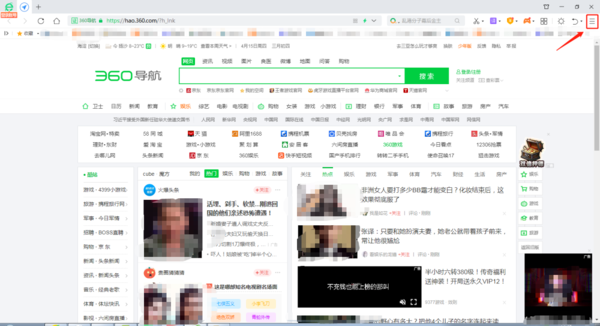 2、在360浏览器主界面的右上角找到“三”打开菜单选项;