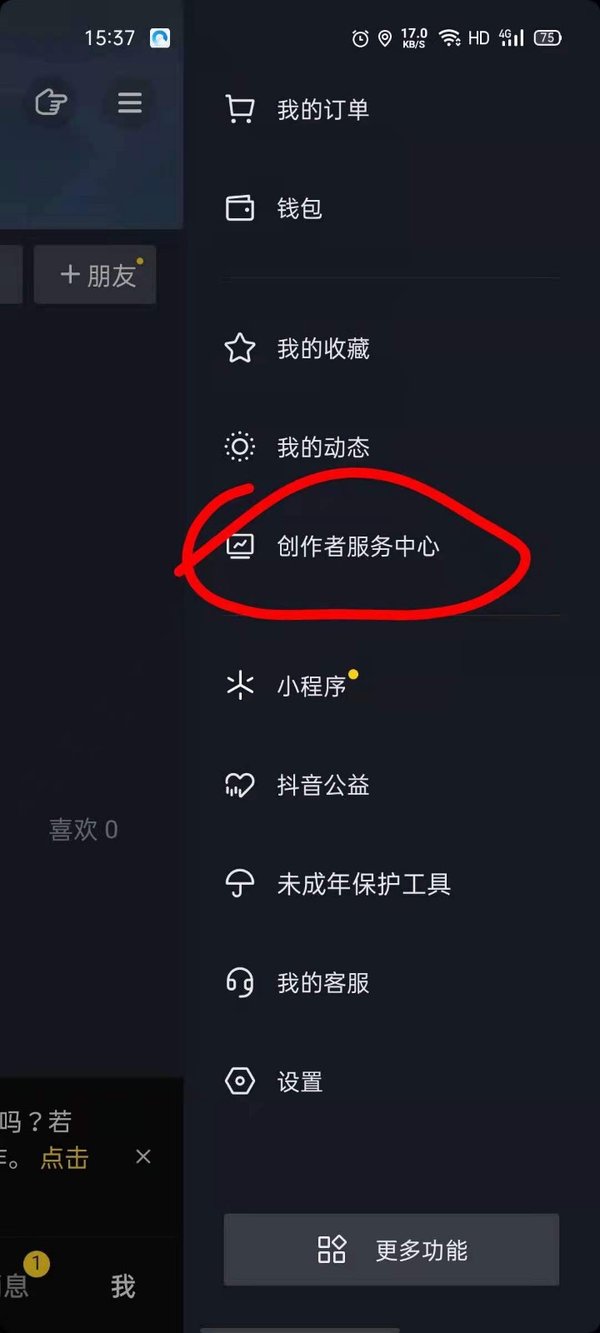第三步,在展开的带单中间位置有一个【创作者服务中心】选项,点击一下。