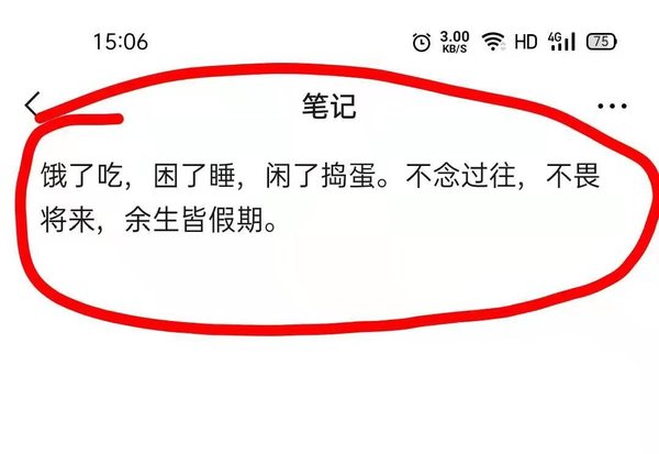 第三步,接下来就可以输入【笔记】了,比如小编比较喜欢的这句:饿了吃,困了睡,闲了捣蛋。不念过往,不畏将来,余生皆假期。