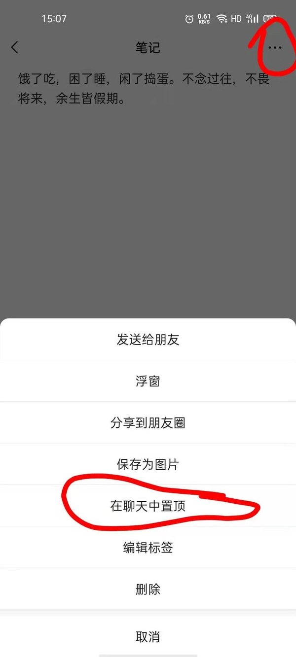 第四步,编辑完成之后,点击页面右上角的【三个点】按钮,在下面的弹窗中点击选择【在聊天中置顶】就可以了。