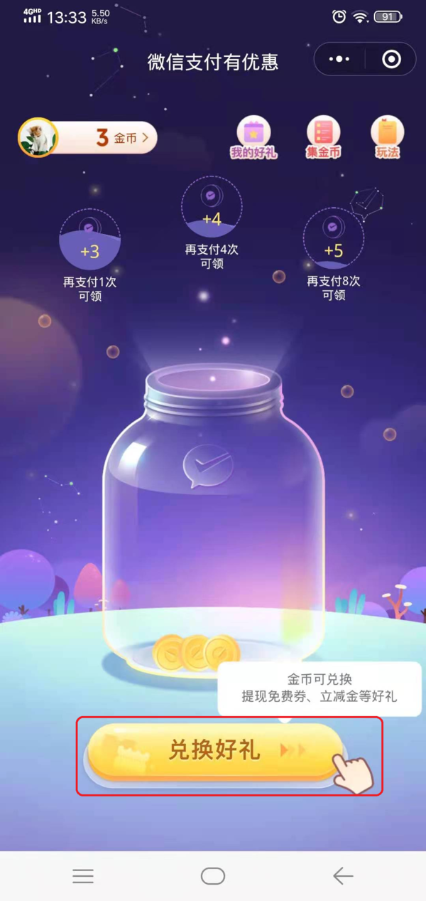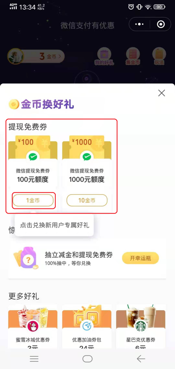 第四步,然后点击界面中的【兑换好礼】按钮,此时我们就可以看到微信提现免费券,点击进行兑换即可。