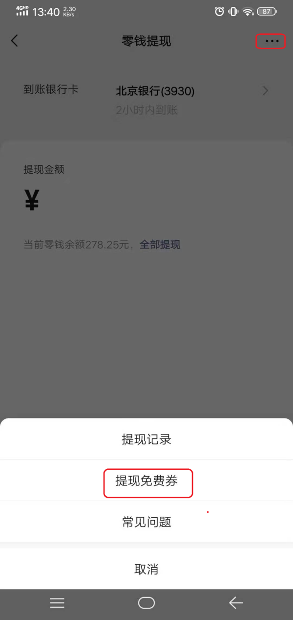 第七步,接着再找到界面右上角的【…】三个点图标,选择【提现免费券】选项。