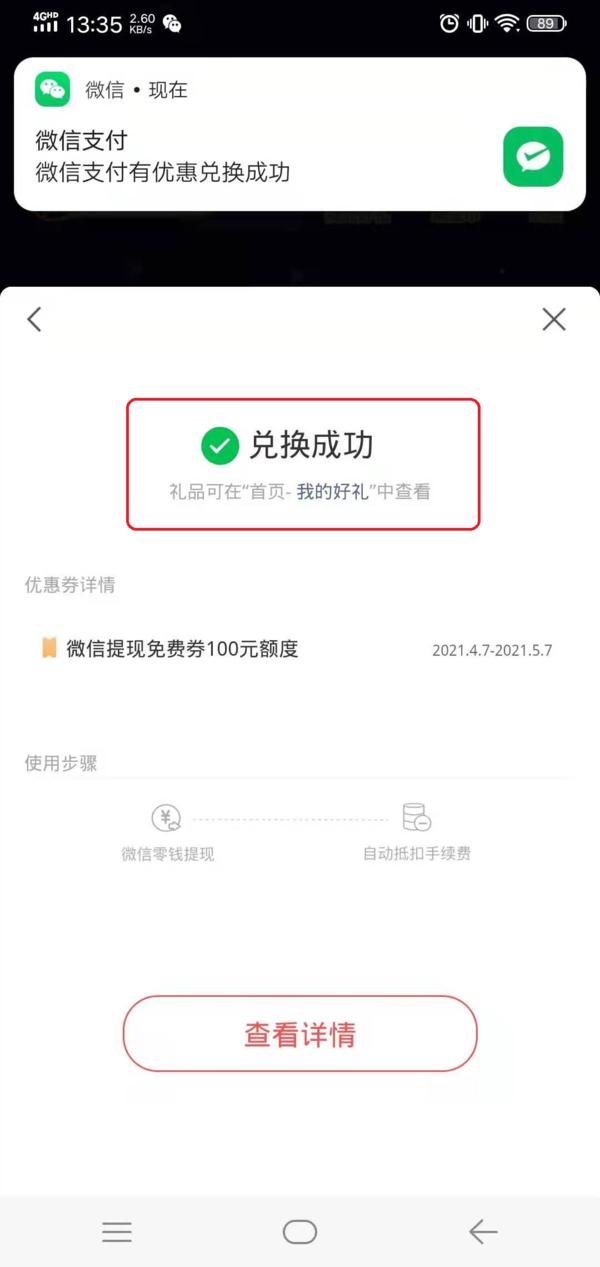 第五步,微信提现免费券兑换成功后,界面就会弹出【兑换成功】的提示了。