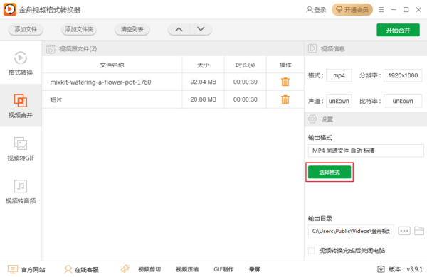 导入视频文件后,点击右侧的选择格式,设置视频合并后输出的格式。