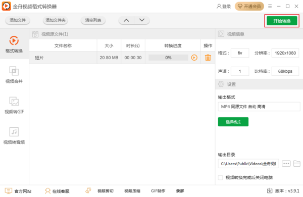 完成以上设置后,点击右上角的开始转换即可进行视频格式的转换。