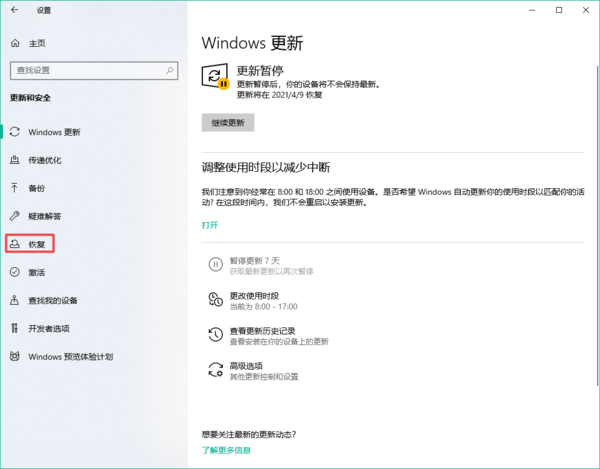 第三步,进入到电脑的【Windows更新】设置窗口当中后,我们在界面的左侧,找到【恢复】选项,并点击打开。