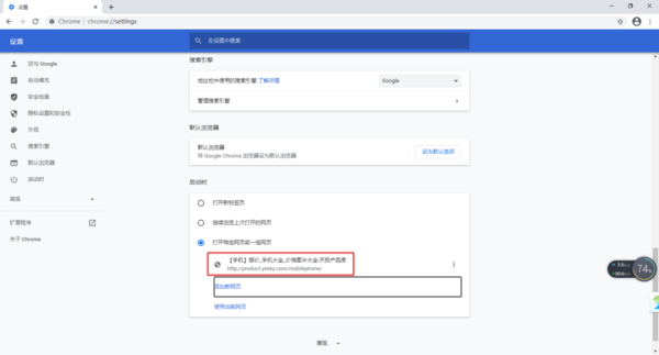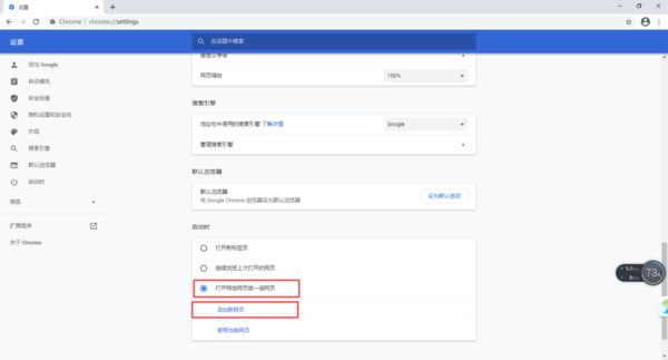 第七步,回到谷歌浏览器的设置界面后,我们就可以在【启动时】的选项中,看到刚刚所设置好的主页网页了。