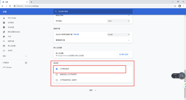 第四步,接着软件就会跳转到浏览器的【设置】界面中,在此界面中,我们向下滑动,直到找到【启动时】的设置选项,然后我们在此可以看到,谷歌浏览器默认启动时是【打开新标签】。