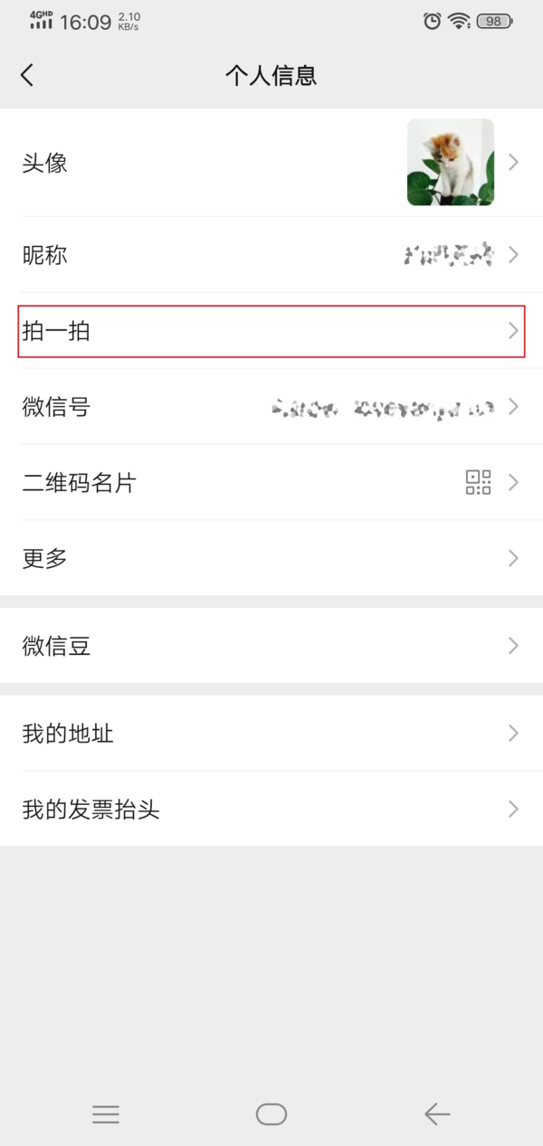 第六步,接着我们就进入到微信的个人信息界面了,在此界面中,我们找到【拍一拍】功能,并点击进入。