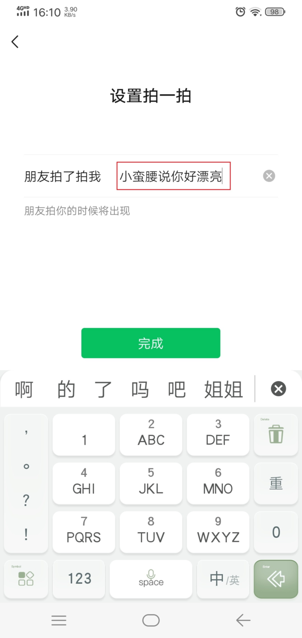 第七步,然后我们就可以设置我们拍一拍后面的文字内容了,根据自己的实际需要来进行设置即可,文字设置完成后,点击【完成】按钮。