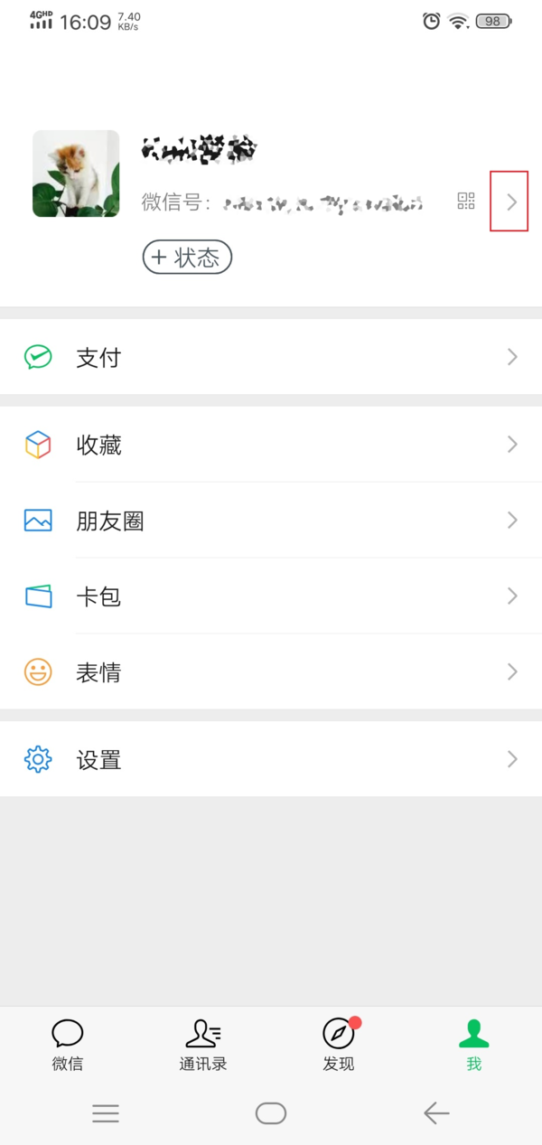 第五步,然后在弹出的界面中,找到微信名称右侧的向右的小箭头,并点击它。