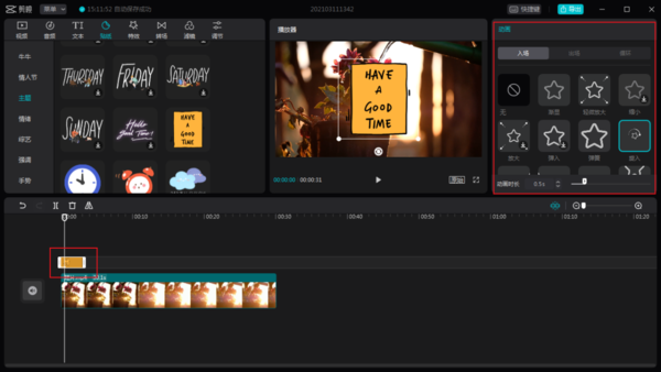 在剪辑轨道上我们可以调整贴纸出现的时间和长度。在右侧的动画菜单中,我们可以选择贴纸的入场、出场动画,以及动画时长。