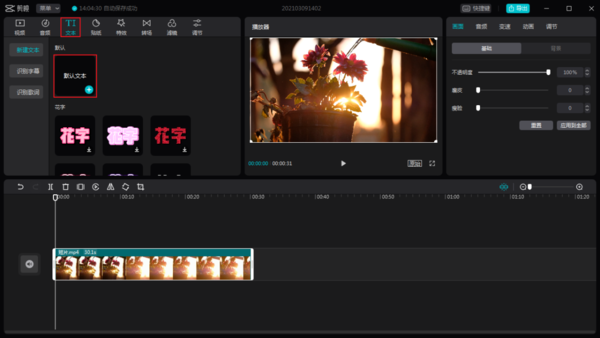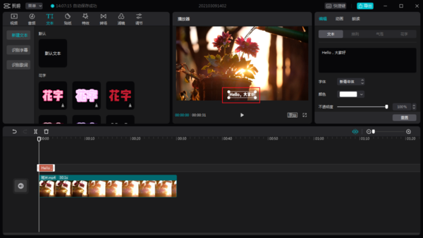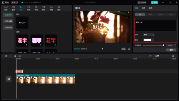 创建字幕后,可以在右侧的工具栏中填写字幕文字,调整字幕的字体及颜色。