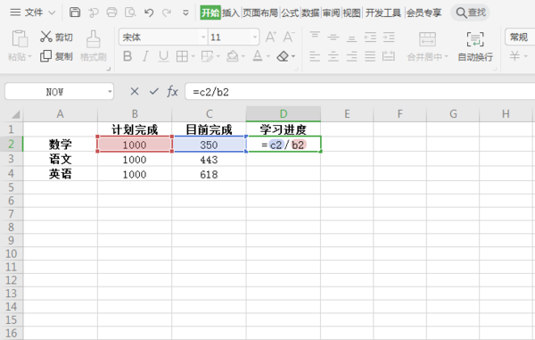 在学习进度下输入公式=完成量/计划量,也就是=c2/b2,计算出目前完成情况。