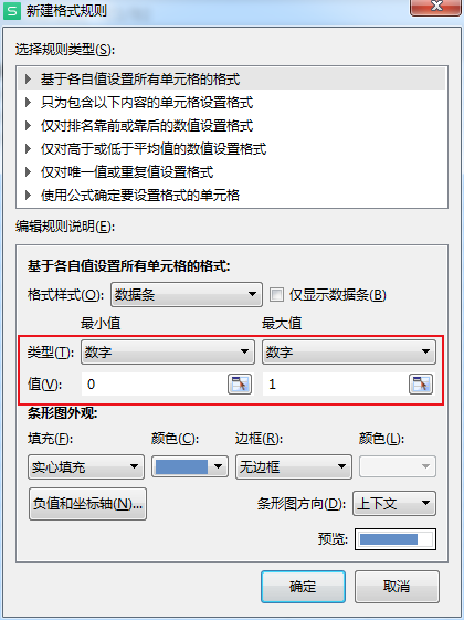 在规则设置中,将类型更改为数字,最小值输入0,最大值输入1,点击确定。