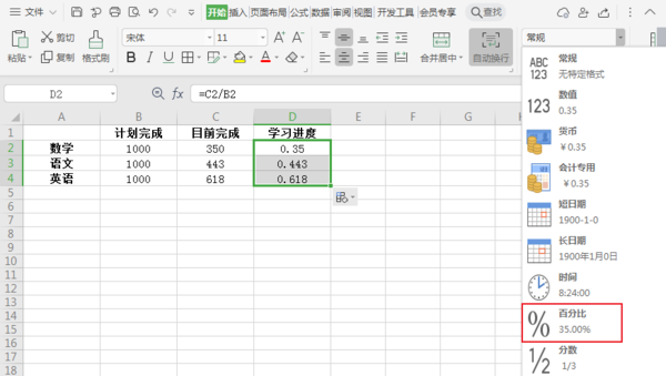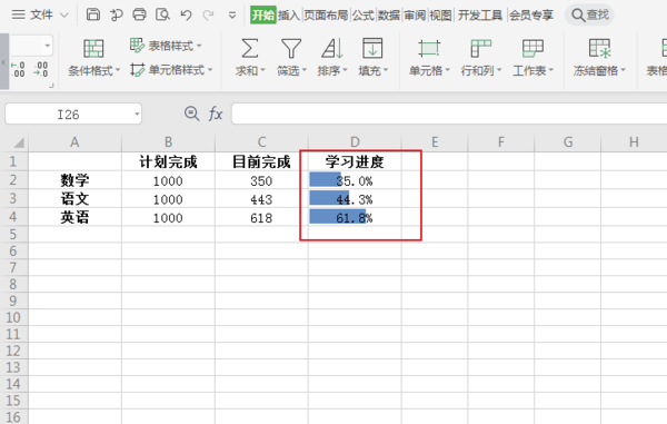 以上就是在WPS表格中计算完成率,并将完成率用进度条显示的方法了,数字和进度条相结合后,是不是对于学习进度有了更直观的了解呢。