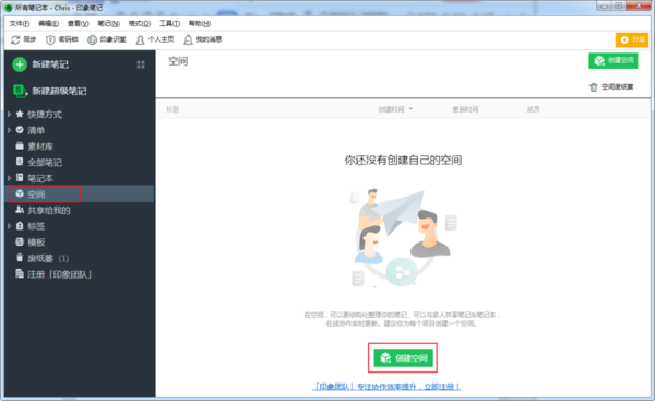 首先打开印象笔记,选择空间选项,点击创建空间。