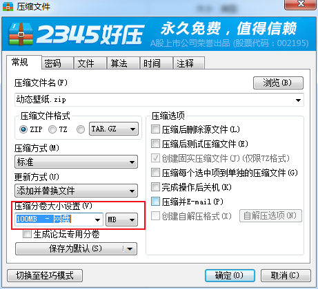 在压缩设置中,将压缩分卷大小设置为需要的大小,点击确定。
