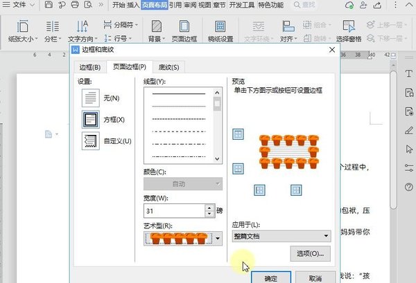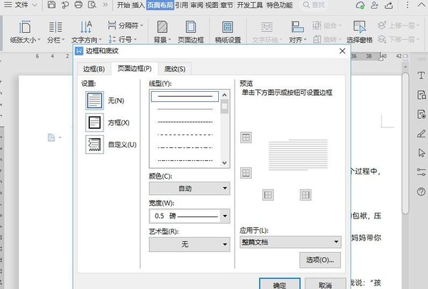 ?以此文档为例,依次点击页面布局-页面边框,在“边框和底纹”界面选择“页面边框”。