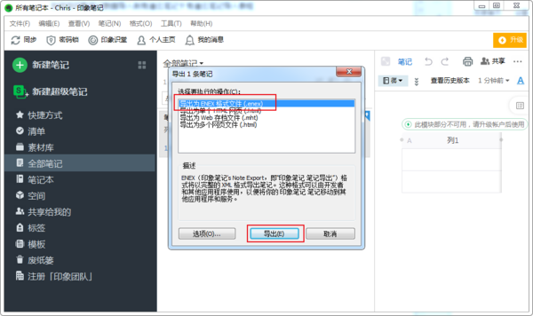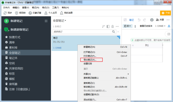 首先在印象笔记中选择需要导出的笔记,右键点击后选择导出笔记。