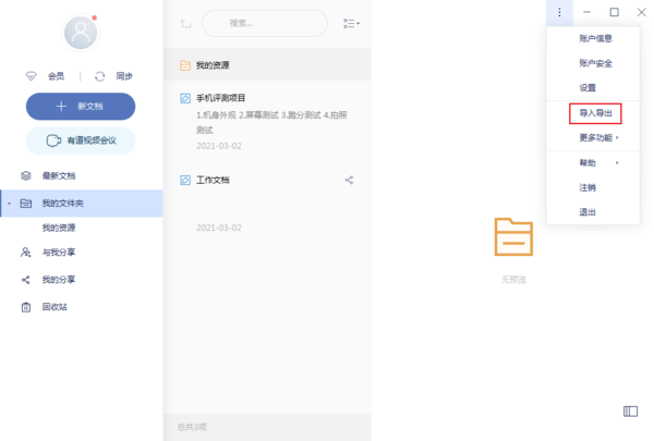 打开有道云笔记,点击右上角的设置,选择导入导出。