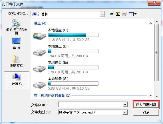 在弹出的对话框中选择需要下载的BT种子文件,点击存入百度网盘。