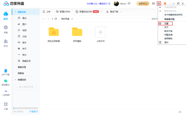 首先打开百度网盘,点击右上角的设置按钮,选择设置。