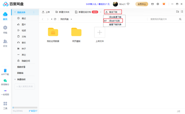完成以上设置后,再次双击BT文件后,百度网盘就会自动开始下载。除此之外,我们也可以手动下载BT种子文件。