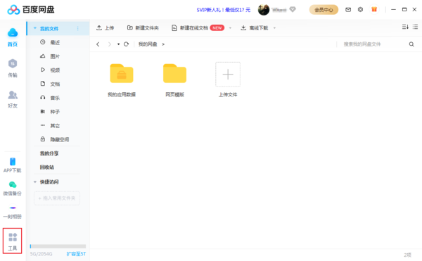 首先打开百度网盘,点击左侧边栏中的工具。