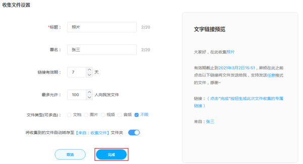 在收集设置中输入标题和署名,设置好链接有效期和文件类型后,点击完成。