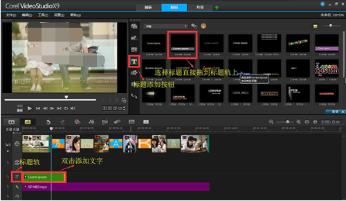 2)、在标题字幕中选择合适的标题格式拖入到覆叠轨中;