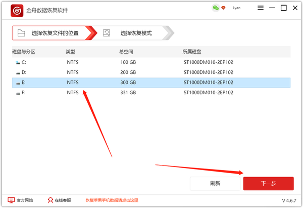 第一步、双击打开软件后,如图,选择需要恢复文件的所在位置,点击“下一步”。