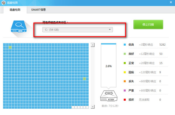 第三步,点击选择需要进行扫描检测的【磁盘分区】,小编这里先从C盘开始,点击右面的【开始扫描】即可。