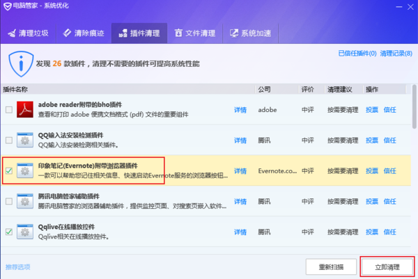 等待软件扫描插件后,选择需要清理的多余插件,点击立即清理。