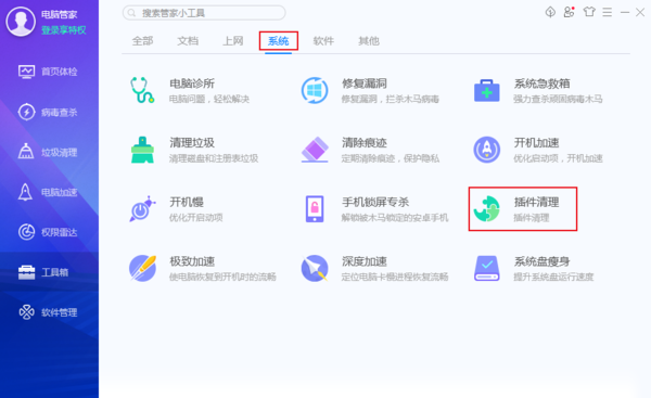 当我们给电脑安装新的软件时,系统会自动为软件加载与其相关的插件或组件,但是这些插件并不是全部有用的,一些多余的插件只会占用我们的存储空间,可能还会造成不必要的卡顿,因此对于无用的插件,我们可以使用腾讯电脑管家进行清理。