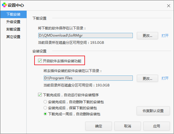 将安装设置下方的开启软件去插件安装功能开启,点击应用、确定即可。